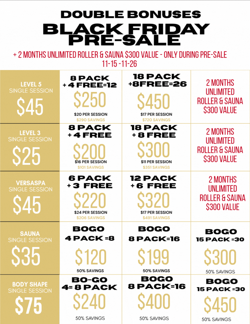 With every Black Friday package, receive 2 months of UNLIMITED sessions in our Infrared Sauna and 1-2 months of UNLIMITED sessions in our Body Shape Roller.